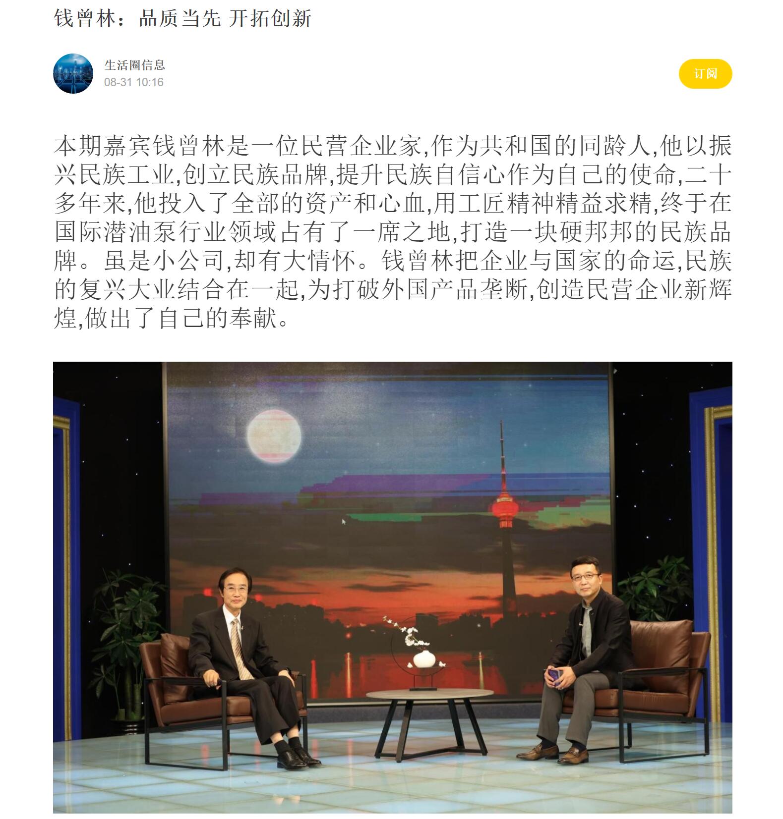本期嘉賓錢曾林是一位民營企業(yè)家,作為共和國的同齡人,他以振興民族工業(yè),創(chuàng)立民族品牌,提升民族自信心作為自己的使命,二十多年來,他投入了全部的資產(chǎn)和心血,用工匠精神精益求精,終于在國際潛油泵行業(yè)領(lǐng)域占有了一席之地,打造一塊硬邦邦的民族品牌。雖是小公司,卻有大情懷。錢曾林把企業(yè)與國家的命運(yùn),民族的復(fù)興大業(yè)結(jié)合在一起,為打破外國產(chǎn)品壟斷,創(chuàng)造民營企業(yè)新輝煌,做出了自己的奉獻(xiàn)。